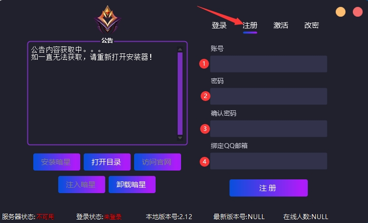 ⼆、点注册、输⼊账号密码QQ邮箱注册暗星